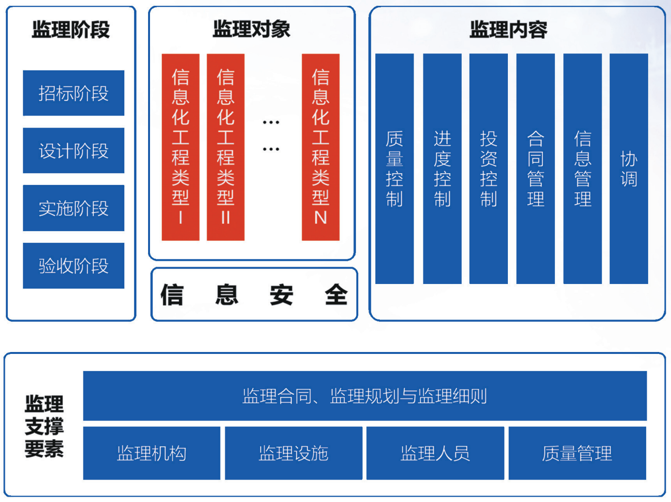 依照《信息系統工程監理服務標準體系》的相關要求,通過"四控制"、"三管理"、"一協調"的手段,采取科學的組織措施、技術措施、經濟措施,協助業主對項目建設的全過程進行檢查監督和協調管理;同時從項目事后審計的視角,對項目全生命周期里的各種申報、審核、備檔流程組織多方論證,對所需材料按照國家檔案管理的相關標準統一匯編,并移交業主單位;確保項目建設行為合法、合規、科學、經濟,達到建設合同約定的目標。?